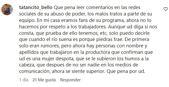 “Qué pena leer comentarios en las redes sociales de su abuso de poder, los malos tratos a parte de su equipo. En mi casa éramos fans de su programa, ahora no lo hacemos por respeto a los trabajadores”, escribió el usuario identificado como “tanancito_bello”.