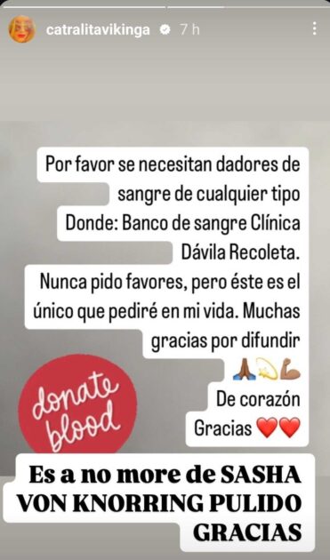 En sus historias detalló que las donaciones deben realizarse en el Banco de Sangre de la Clínica Dávila (Recoleta, región Metropolitana), a nombre de Sasha Von Knorring Pulido.