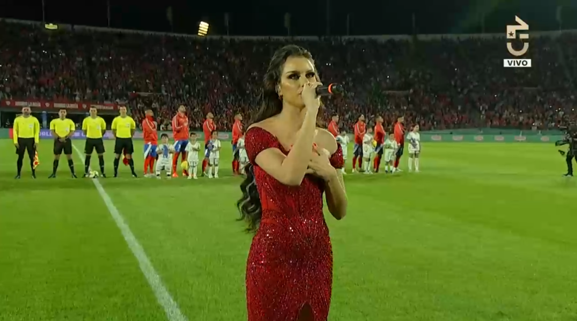 Con un elegante y ajustado vestido rojo, Emilia Dides interpretó la canción patria, antes del partido llevado a cabo en el Estadio Nacional desde las 21:00 horas.