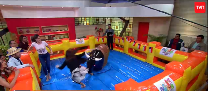 ‘Chiqui’ Aguayo terminó en el suelo tras desafiar a un toro mecánico en el matinal de TVN