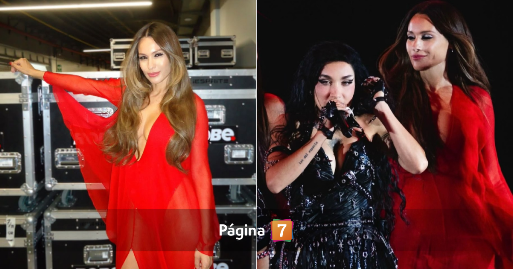 Pero lo que más llamó la atención es que Pampita también apareció en el show cuando comenzó a sonar la canción “Sexo es la moda”. Llevó un impresionante vestido rojo, escotado, para recorrer el escenario 360°, mientras la cantante estaba en el medio del mismo.