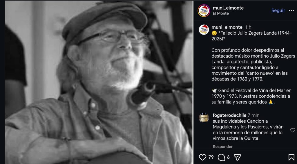“Con profundo dolor despedimos al destacado músico montino Julio Zegers Landa, arquitecto, publicista, compositor y cantautor ligado al movimiento del “canto nuevo” en las décadas de 1960 y 1970″, escribieron en dicha red social.