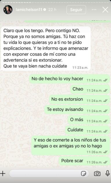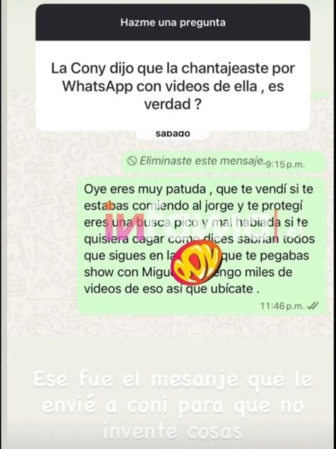 Tras ello, Constanza dio a conocer el hecho de las amenazas de difusión de un video íntimo. Sin embargo, Ignacia también habló rápido y no dudó en compartir el chat privado con la bailarina en redes sociales.