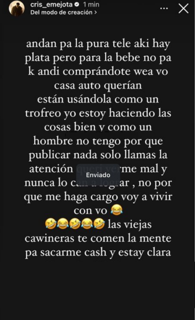 “Aquí hay plata, pero para la bebé, no para que andes comprándote hue… vo’. Casa, auto querían… están usándola como un trofeo”, escribió en sus historias de Instagram.