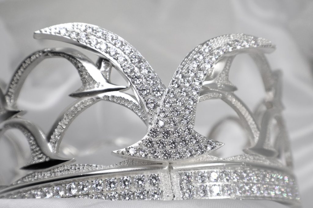 La corona de la reina pesa 286,27 gramos y está elaborada en plata ley 925 ecológica, obtenida a partir de procesos de reciclaje de metal, incorporando 50 circones de alta calidad en su estructura.
