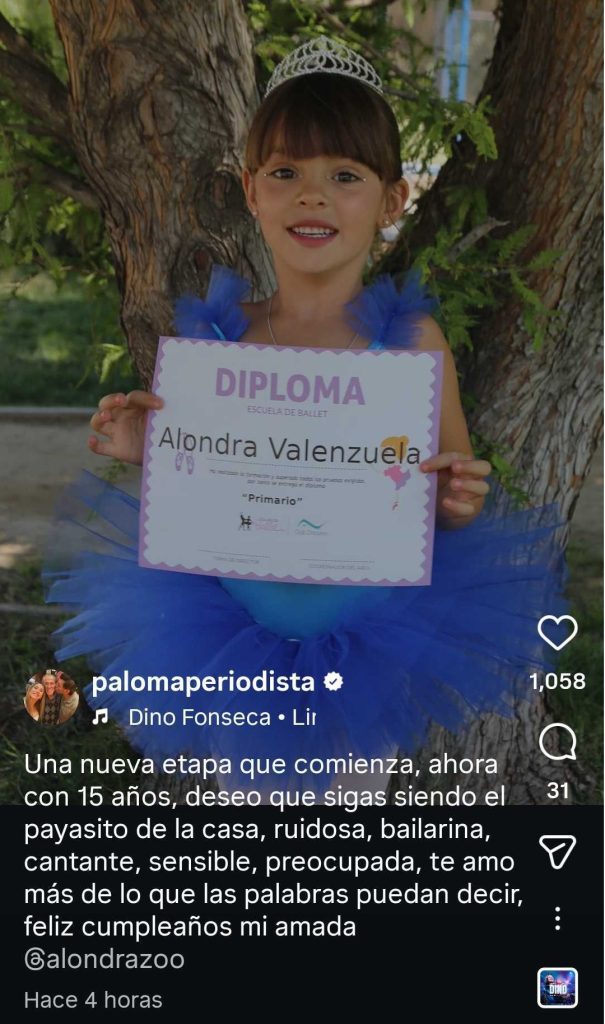 “Una nueva etapa que comienza, ahora con 15 años, deseo que sigas siendo el payasito de la casa, ruidosa, bailarina, cantante, sensible, preocupada. Te amo, más de lo que las palabras puedan decir. ¡Feliz cumpleaños mi amada Alondra!”, añadió la periodista.
