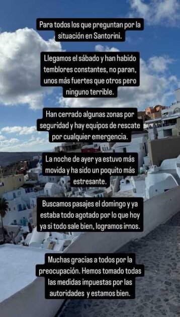 “Para todos los que preguntan por la situación de Santorini. Llegamos el sábado y ha habido temblores constantes, no paran, unos más fuertes que otros, pero ninguno terrible”, contextualizó.