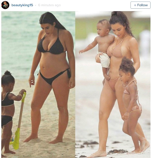 Kim fue fotografiada mientras caminaba junto a sus hijos Saint y North West. La empresaria lucía un bikini a crochet de color piel, el cual resaltaba su escultural figura y su notable pérdida de peso, tras dar a luz a su hijo en diciembre del año pasado.
