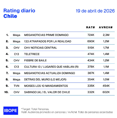 Así, en el mismo bloque horario, Chilevisión promedió 463.577 personas, posicionándose en el segundo lugar de la tabla.