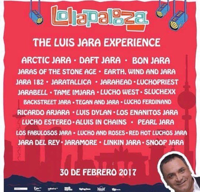En el cartel se pueden leer bandas como: Arctic Jara, Daft Jara, Bon Jara, Jaras of the Stone Age, Earth, Wind and Jara, Jara 182, Jaratallica, Jarahead, Luchopriest, Tame Imjara, Lucho Ferdinand, Luis Dylan, Pearl Jara o Aluis in Chains, entre otros.