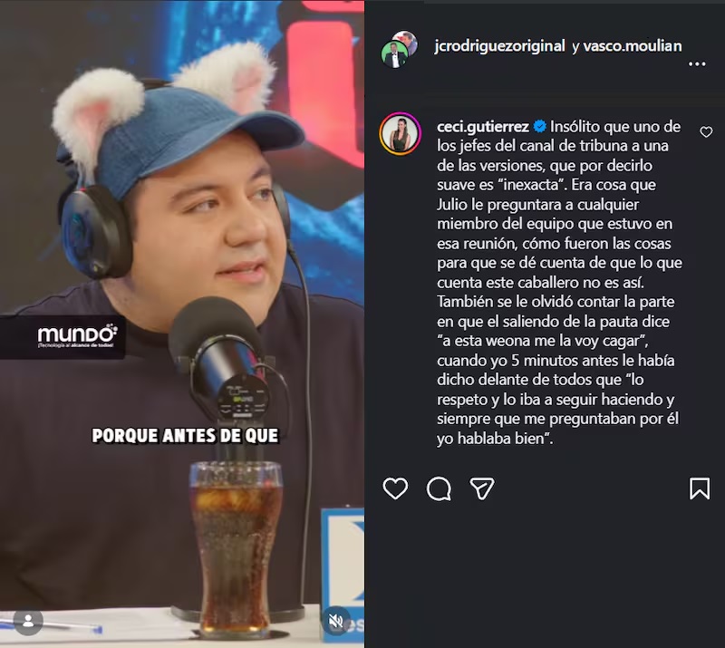 El registro de esa conversación fue compartido en Instagram por el director de programación de Chilevisión, lo que no pasó desapercibido para Gutiérrez, quien reaccionó directamente en los comentarios de la publicación.