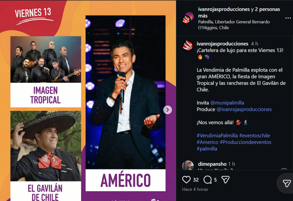 “¡Cartelera de lujo! La Vendimia de Palmilla explota con el gran Américo”, anunciaron desde el Instagram del la productora durante la tarde de este viernes.