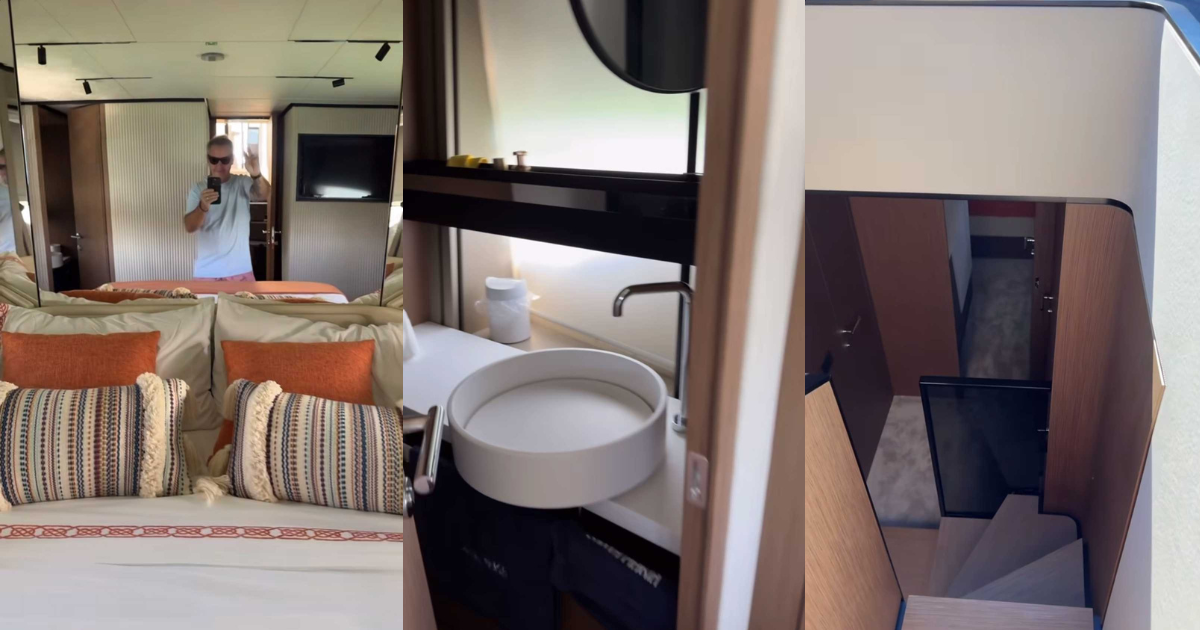 En otras historias, Viñuela mostró el interior del yate, en donde se ve una escalera que divide sus dos niveles, como también sus pequeños y elegantes baños y dormitorios.