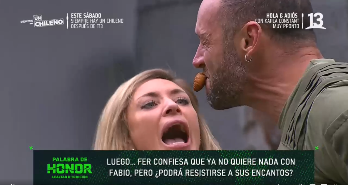 Tal como se mostró en pantalla, los concursantes del reality de Canal 13 debían sacar un producto “asqueroso” de un recipiente, pasárselo a sus parejas con la boca y luego este último debía dejarlo en otro envase.