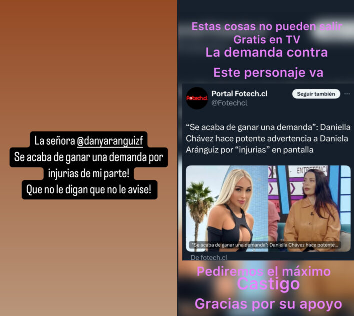 A lo que Daniella Chávez respondió sin dudar: “La señora Daniela Aránguiz se acaba de ganar una demanda por injurias de mi parte”, anunció.