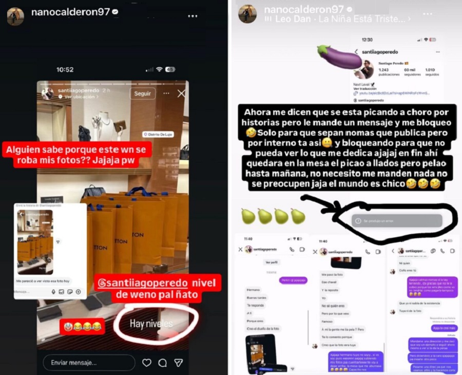 “Nano Calderón obviamente le escribe. Lo escribe primero en sus redes, también le escribe por interno (…) lo acusa de haberle robado las fotos y dice incluso ‘que me dé una dirección’ o algo así para encontrarlo”, explicó Gutiérrez entonces.