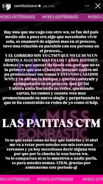 Se trata de un escrito en donde Camilo se desahoga por los comentarios que lo apuntan a él como el infiel de la relación, desmintiendo esto e incluso apuntando contra Denise.