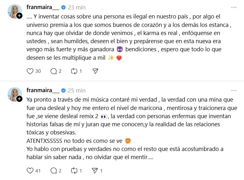 “Atentos, no todo es lo que se ve”, advirtió Fran Maira, asegurando que ella “habla con pruebas y verdades, no como el resto que está acostumbrado a hablar sin saber nada”.