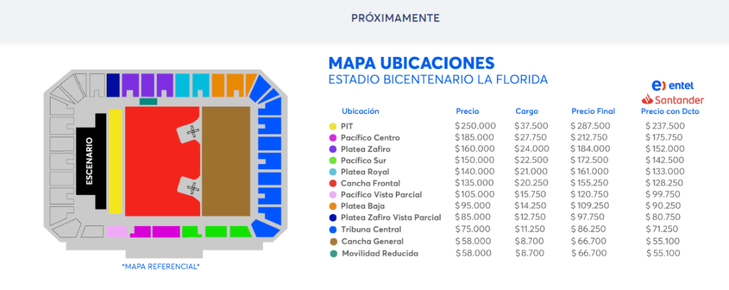 Finalmente, se informó que los preciosnormales de las entradas van desde los $66.700 hasta los $287.500, incluido el cargo por servicio. Revisa a continuación el detalle de los precios con descuento y según sus ubicaciones: