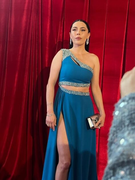 La panelista de Sígueme, de TV+, apostó por un ajustado vestido asimétrico azul con brillantes, el que resaltó su figura.