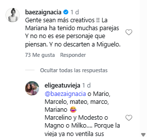 Quien sí alzó la voz fue Ignacia, revelando que no se trataba del periodista. “Gente, sean más creativos. La Mariana ha tenido muchas parejas y no, no es ese personaje que piensan. Y no descarten a Miguelo”, cerró.