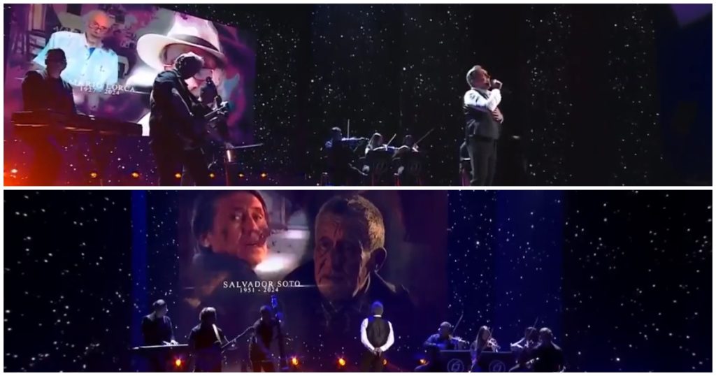 Mientras cantaba Recuérdame, en el escenario se mostraban imágenes de los actores que fallecieron en 2024: Mario Lorca, Salvador Soto, Claudio Reyes, Julio Gandolfi y Walter Kliche.