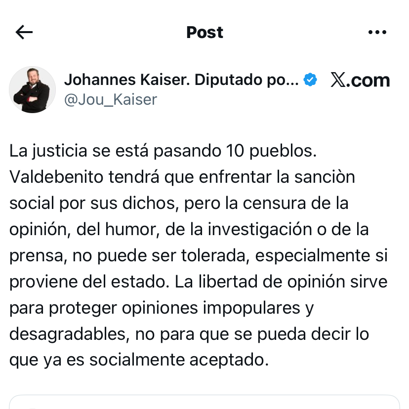 Bajo ese contexto, Kaiser agregó: “Valdebenito tendrá que enfrentar la sanción social por sus dichos, pero la censura de la opinión, del humor, de la investigación o de la prensa, no puede ser tolerada, especialmente si proviene del estado“.