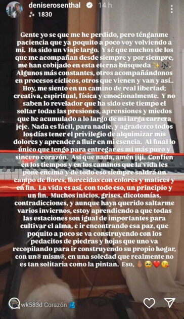 Desde hace varios meses que Denise Rosenthal ha estado alejada de las redes sociales y los medios. Sin embargo, justo en medio de estas especulaciones, la cantante compartió un llamativo mensaje en su cuenta de Instagram.