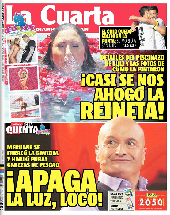 Es que el diario popular hizo énfasis en el hecho de que Luli no sabe nadar y en su portada y también en las páginas interiores no mostró lo hermosa que se veía y lo lindo de su piquero, sino que puso fotos en las que no se ve para nada favorecida y los titulares tampoco son de los más agradables, al menos según lo calificaron los rostros del matinal del 13, “Casi muere la flor” y “Casi se nos ahogó la reineta” fueron las palabras seleccionada por los periodistas del medio de circulación nacional.