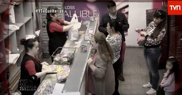 “Ubíquese”, “hágalo usted mejor”, “no sea discriminadora”, le gritaron varias mujeres. Lo que no sabían es que la joven que empaquetaba es una actriz llamada Constanza Sanhueza y quien la ofendía, también era otra actriz, Isabel Garay, quienes ponían a prueba a los clientes en el lugar.