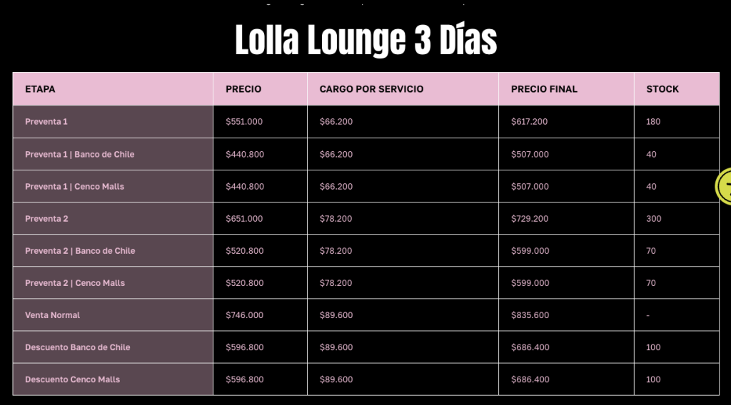 La venta de entradas para Lollapalooza Chile 2027 comenzará el próximo 31 de marzo a las 12:00 horas en Ticketmaster.cl, iniciando con los codiciados tickets Early Bird y siguiendo con las etapas de Preventa 1 para los Pases de 3 Días General, Lounge y Platinum.