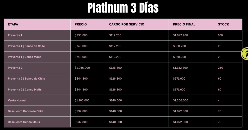 - Cenco Malls: Dispondrá de 15.000 descuentos del 20% distribuidos entre todos los tipos de pases desde Preventa 1. Para acceder, los usuarios deben descargar su código en la App Mi Mall. (Máximo 4 entradas por código).