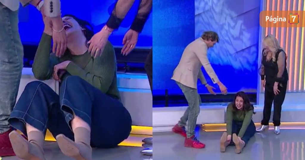 En ese contexto, la animadora decidió sentarse en una parte del set, pero no calculó bien y terminó en el suelo.