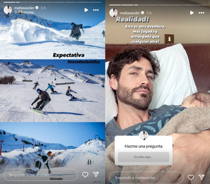 “Expectativa”, escribió junto a una serie de fotos esquiando en la nieve en Chillán. “Realidad”, expresó con la imagen en la que está con su hija.