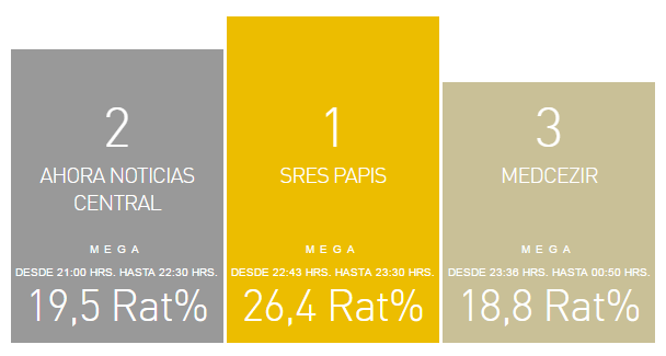 Todo esto en un día redondo para Mega, pues el canal promedió 10,8 puntos y lideró con casi todos sus programas del día de ayer, completando 22 horas seguidas (entre las 8 am de ayer y las 6 am de hoy) en el número 1.