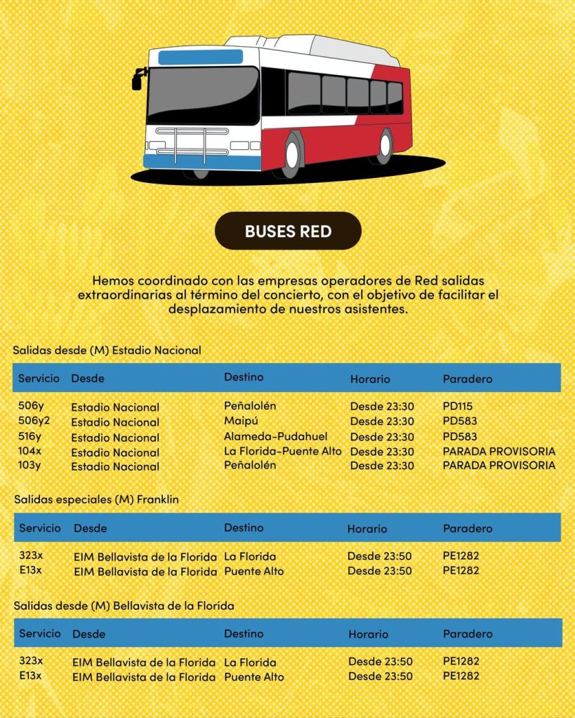 A estas medidas se sumará un refuerzo de buses de Red Movilidad, los que comenzarán a circular entre las 23:30 y las 23:50 horas, como parte del plan de contingencia para eventos masivos en el Estadio Nacional.