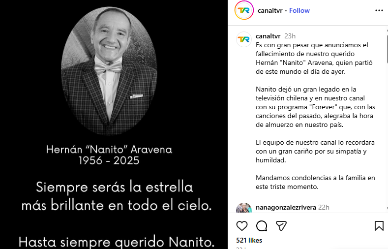 “Es con gran pesar que anunciamos el fallecimiento de nuestro querido Hernán ‘Nanito’ Aravena, quien partió de este mundo el día de ayer. Nanito dejó un gran legado en la televisión chilena y en nuestro canal con su programa Forever, que con las canciones del pasado alegraba la hora de almuerzo en nuestro país”, expresaron desde TVR.