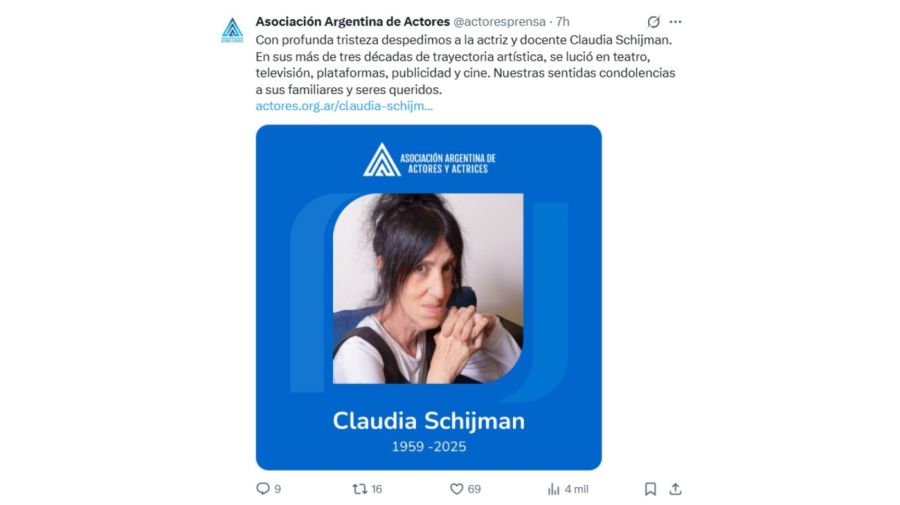 En el comunicado declararon: “Con profunda tristeza despedimos a la actriz y docente Claudia Schijman“