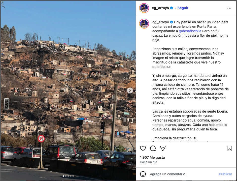 En conversación con Página 7 sobre su paso por el sector, Carmen Gloria fue tajante al describir la magnitud del daño. “Hablé con muchas personas. Es inimaginable estar allá”, comenzó diciendo, para luego insistir en la misma idea que dejó en su publicación: “No hay relato, no hay imagen que pueda comunicar lo que se siente estar ahí”.