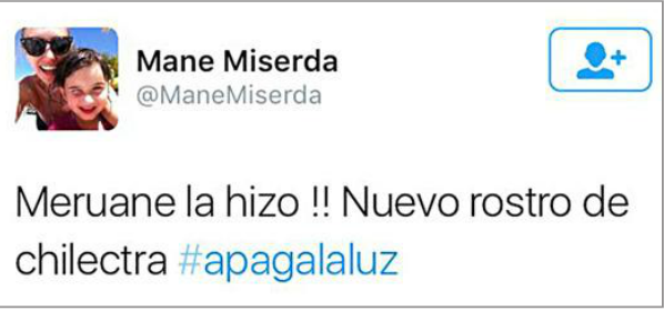Chilectra le acaba de enviar felicitaciones a Meruano por su insistencia en apagar la luz y ahorrar energía. pic.twitter.com/EGGufHuXgR