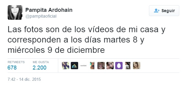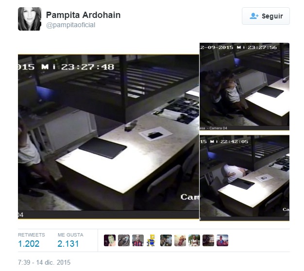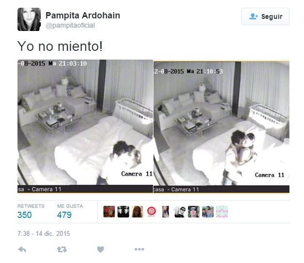 El escándalo continúa y la sorpresa la dio Pampita subiendo íntimas fotografías de las cámaras de seguridad de su casa, en las que aparece con su ahora supuesto ex esposo, Benjamín Vicuña. Con esto, Pampita pretende dar a entender que están nuevamente juntos, desmintiendo al actor, quien publicó en Twitter que lamentaba mucho lo sucedido pero que ya se encontraba separado.
