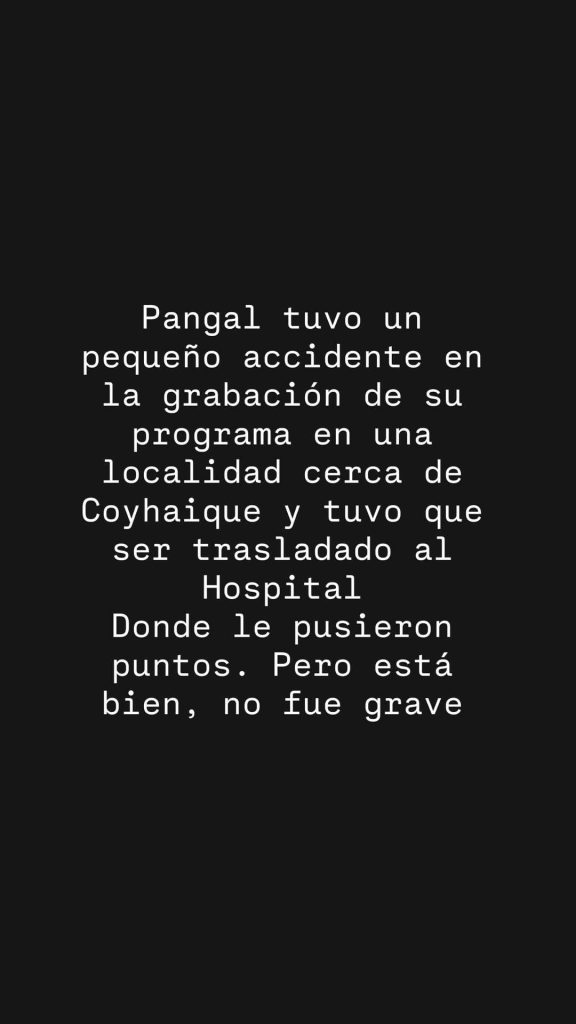 “Pangal tuvo un pequeño accidente en la grabación de su programa en una localidad cerca de Coyhaique”, partió señalando.
