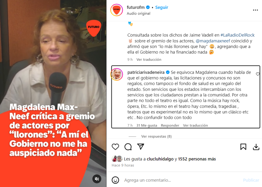 La actriz Patricia Rivadeneira cuestionó las recientes declaraciones de Magdalena Max-Neef, sobre los colegas actores que critican el Gobierno de Gabriel Boric.