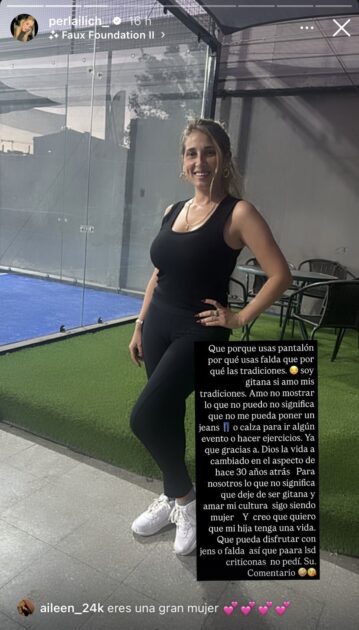 “Por qué estás con calzas si eres gitana (…) Soy gitana, pero también mujer y también puedo hacer ejercicios . También puedo ver la vida de otra manera sin dañar mi cultura”, escribió la empresaria.