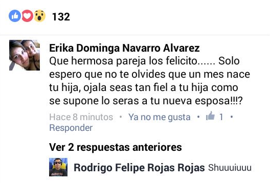 “Que hermosa pareja, los felicito. Sólo espero que no te olvides que en un mes nace tu hija. ¡Ojalá le seas tan fiel a tu hija como se supone le serás a tu nueva esposa!”, escribió Erika Navarro en la publicación.