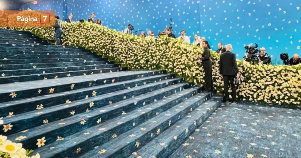 Este año, la alfombra sorprendió con un cambio radical: no fue roja, sino azul noche, decorada con flores blancas y amarillas.