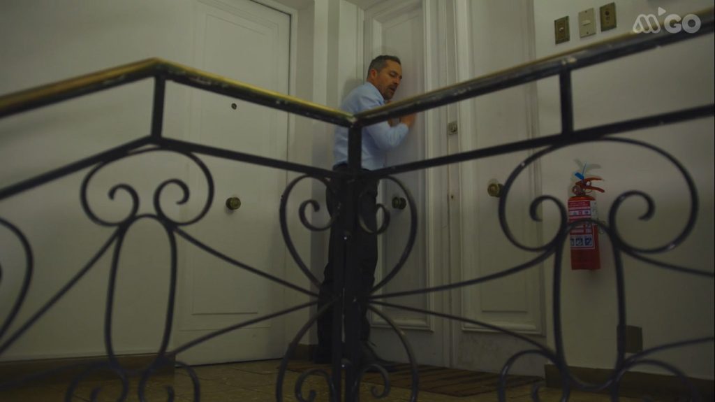El personaje de Romina Norambuena queda petrificado por el horror, pero luego logra reaccionar, alejarse del empresario y amenazarlo con llamar a Carabineros si no se retira de su hogar.