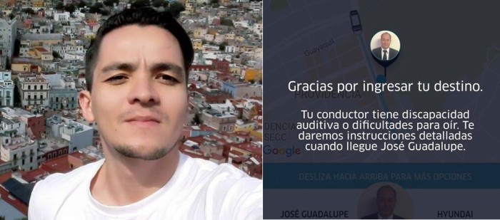 “Hola, les quiero compartir una historia que me pasó. El viernes por fortuna o por desgracia perdí las llaves de mi automóvil (los que me conocen saben que siempre me pasa) y justamente tenía una reunión a la cual tenía que acudir. No tenía otra opción que tomar Uber para llegar a tiempo, abrí la app y al momento me llegó la imagen que les comparto, en la cual me avisaba que una persona con discapacidad auditiva sería mi chófer en ese viaje, me daba la opción de cancelarlo pero decidí no hacerlo, me llegó curiosidad de saber qué me esperaba y de conocerlo.