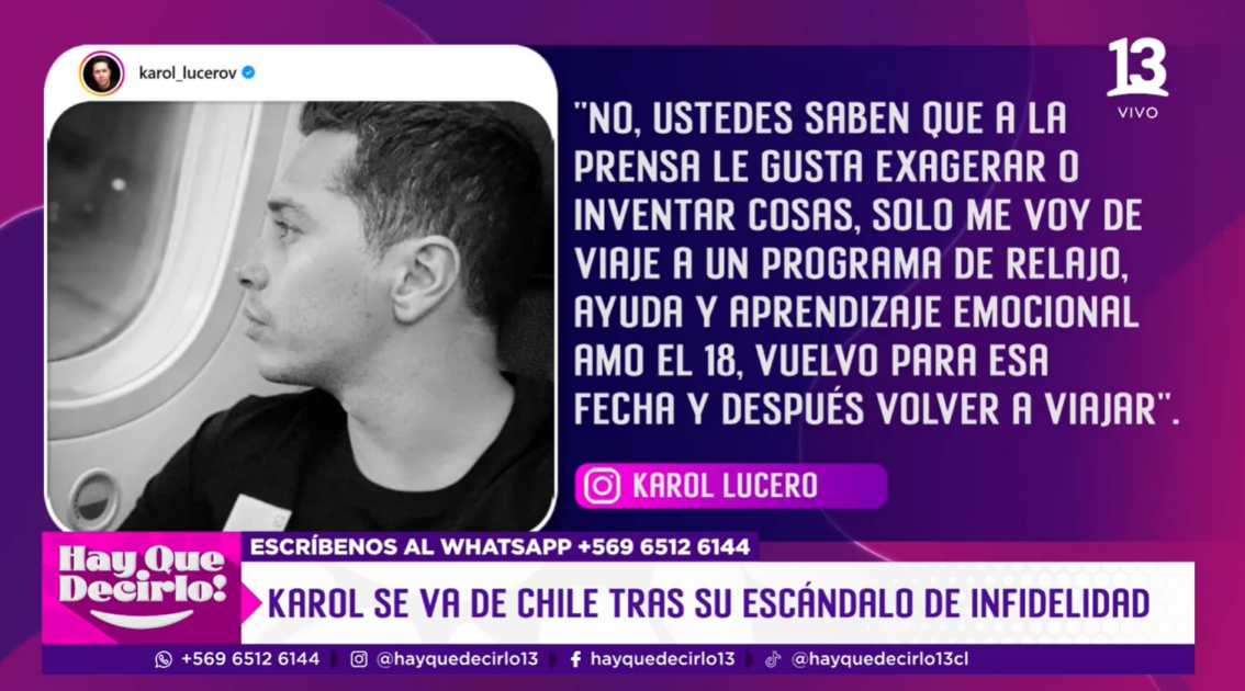 Cabe mencionar que, el propio Karol Lucero explicó en sus redes sociales que este primer viaje sería algo más bien breve, ya que estaría de vuelta para las Fiestas Patrias.