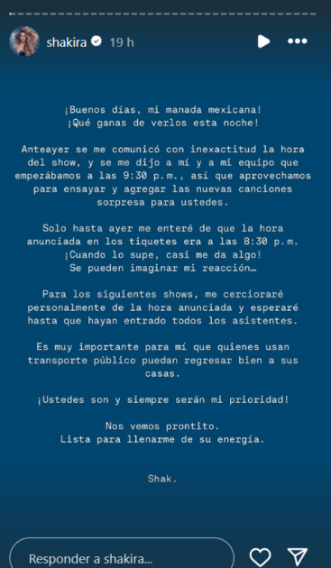 “Para los siguientes shows, me cercioraré personalmente de la hora anunciada y esperaré hasta que hayan entrado todos los asistentes”, prometió Shakira.